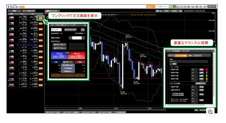 利用者数が多いことでも知られる「DMM FX」では非常に高性能な取引・分析ツール「DMMFX PLUS」を提供しています。
