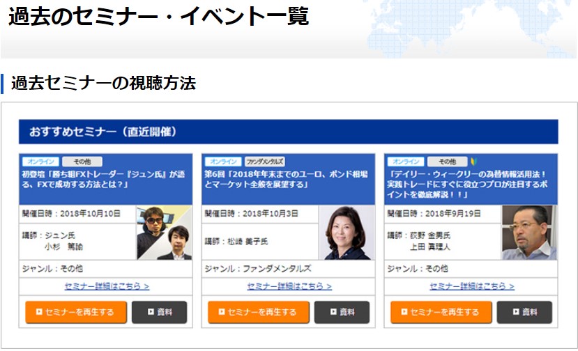 FXの始め方やレバレッジの仕組みといった超基本的な内容のセミナーもあれば、週1回のトレードで月3万円稼ぐための実践テクニックといったセミナーもありますので、ぜひ一度ご覧になってみてください。