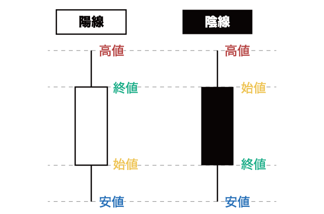 - 陰線:終値よりも始値の方が高いローソク足を指す