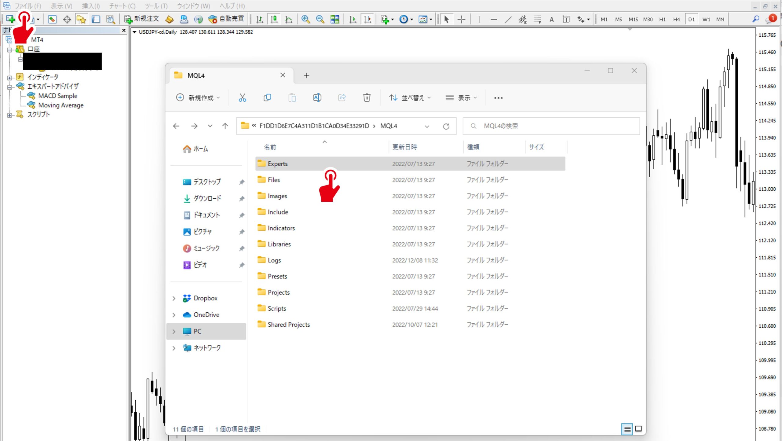 次に「MQL4」というMT4のフォルダをクリックすると「Experts」が表示されますので、そこに使いたいEAのファイルを挿入しましょう。