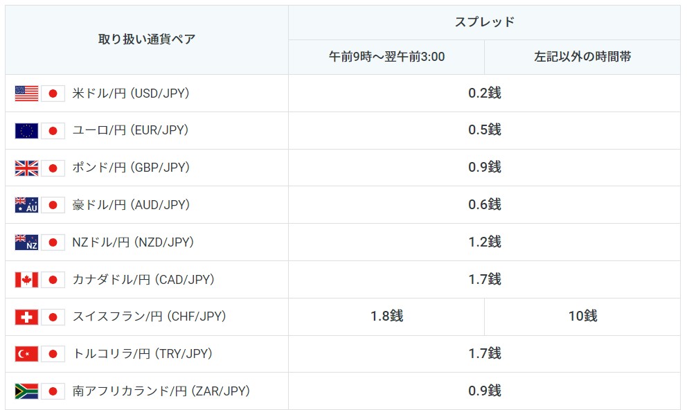「米ドル/円」「ユーロ/円」「ポンド/円」といった主要通貨ペアのスプレッドは軒並み業界最狭クラスの数値となっています。