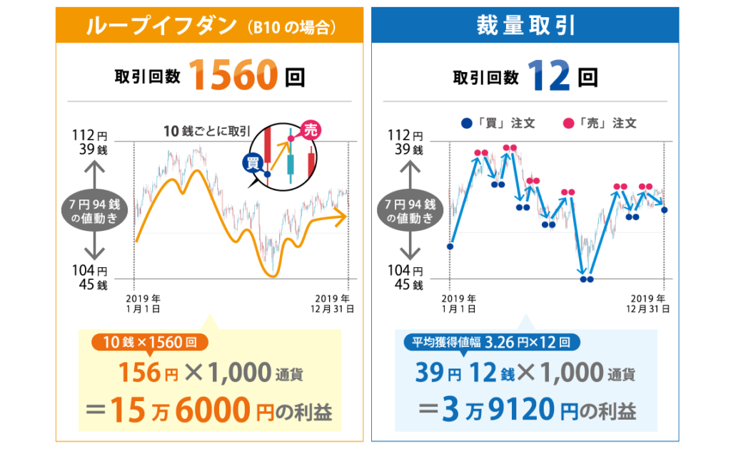 ループイフダンの最大の特徴は、裁量取引(自分で取引する)では追えないような細かい値動きも逃さずトレードをしてくれる点です。