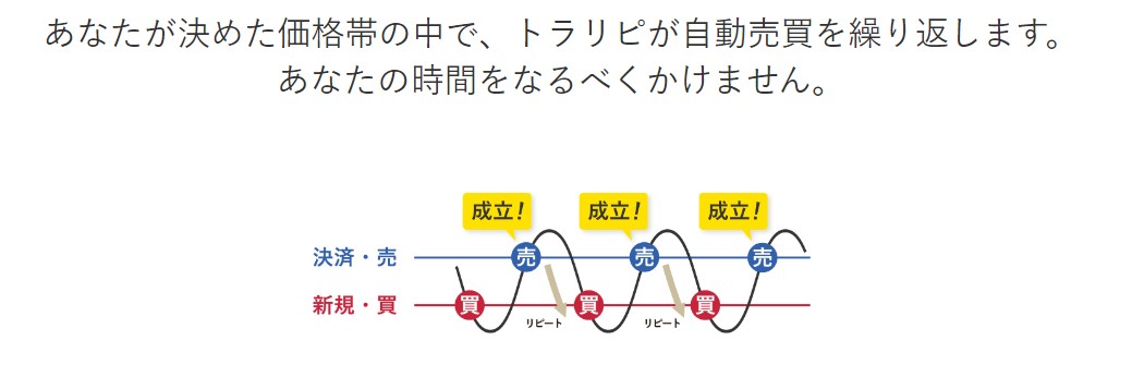 しかし、リピート型自動売買の「トラリピ」なら自分で取引をする必要がないため、時間的にも精神的にも余裕が生まれます。日中は忙しいというサラリーマンの方でも利用しやすい仕組みとなっていますので、ぜひ一度試してみてください。