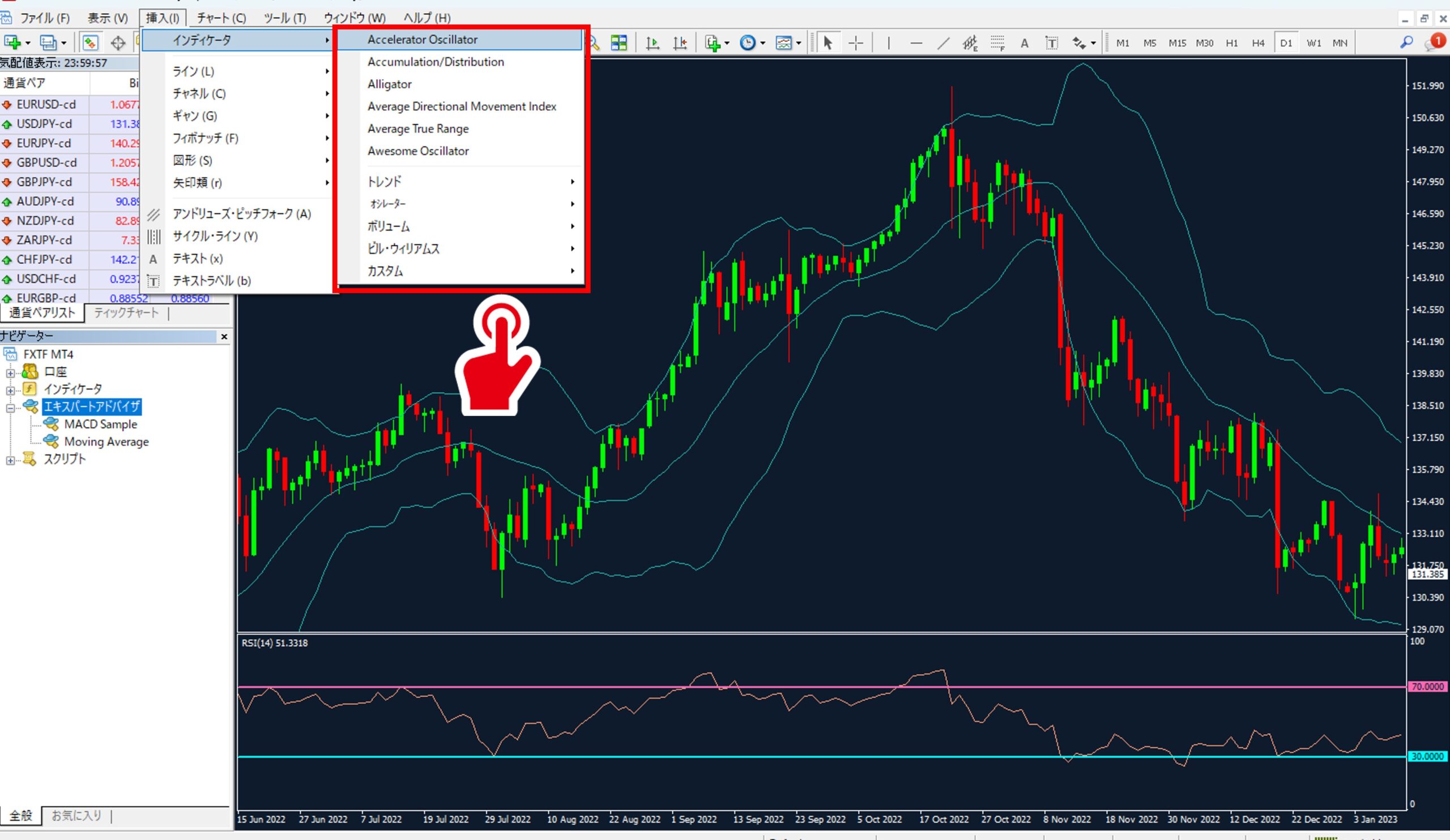 そんなインジケーターをチャート上に表示させる方法を見ていきましょう。