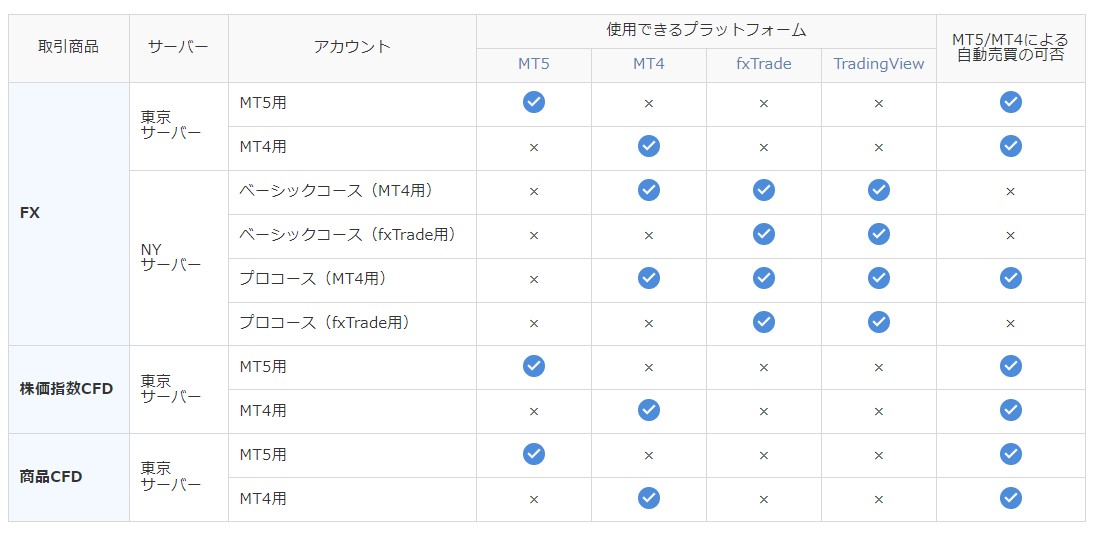 ご覧のようにOANDA証券では選ぶ口座タイプによって「自分ができる取引内容」が変わってきます。
