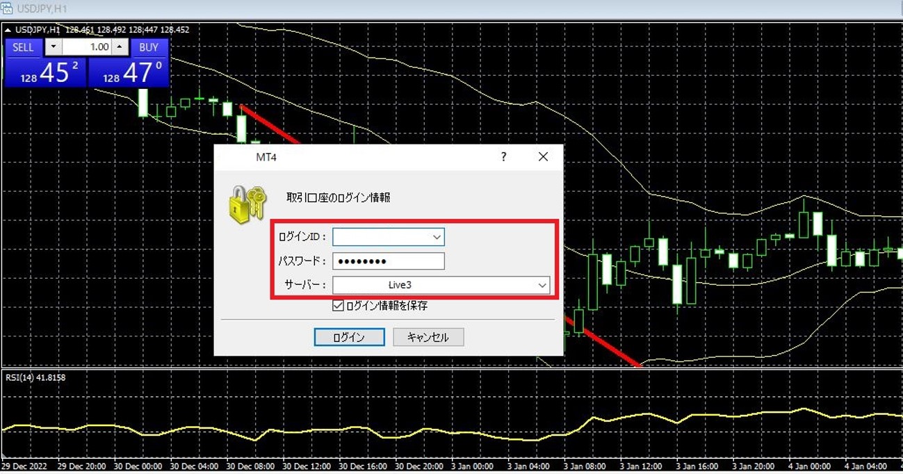 このIDとサーバー名、そして自分で決めたパスワードを入力すればMT4にログインできるということです。