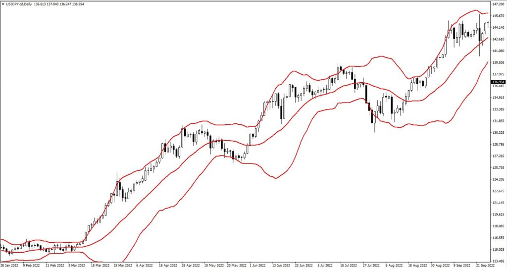 FXのチャートでは上図のような「ローソク足」が表示されます。このローソク足の動きに対し、様々なインジケーターを使って分析をおこなうことがテクニカル分析の基本です(赤線はボリンジャーバンド)。