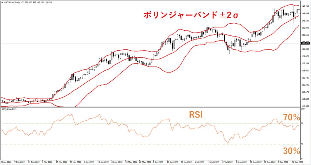 強いトレンドが発生したときにはボリンジャーバンドの線に沿いながら上昇・下降を継続させていきますが、RSIの数値が70%・30%を超えると高い確率で反転が起きます。
