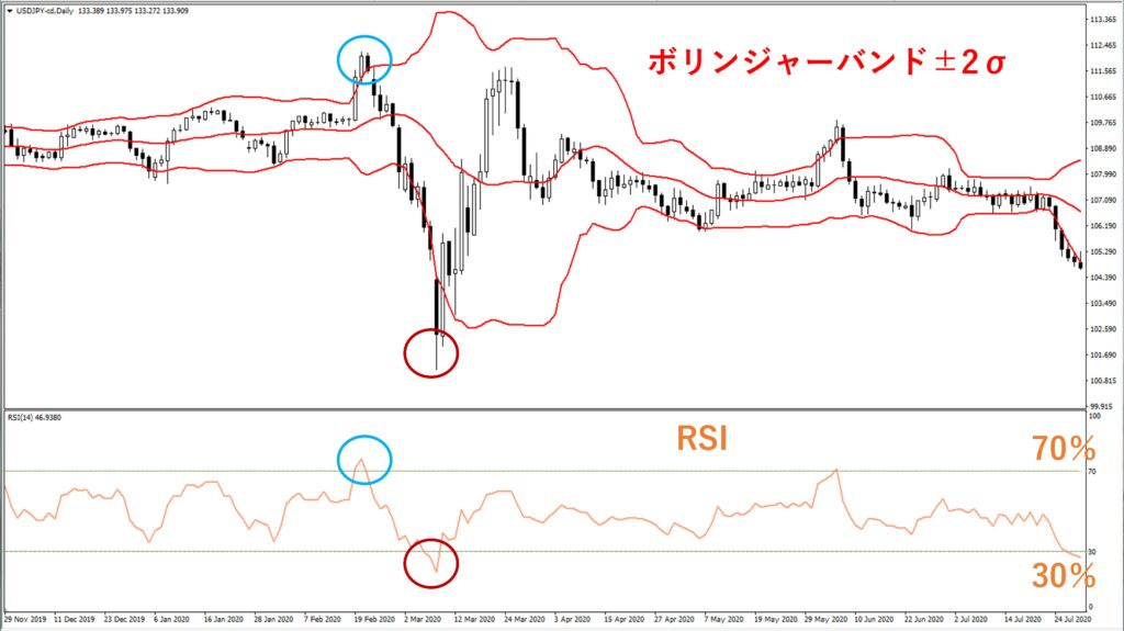 - ボリンジャーバンドの上線にタッチした時点でRSIの数値が70%を超えているため、価格が下がる可能性が高い(青い丸)