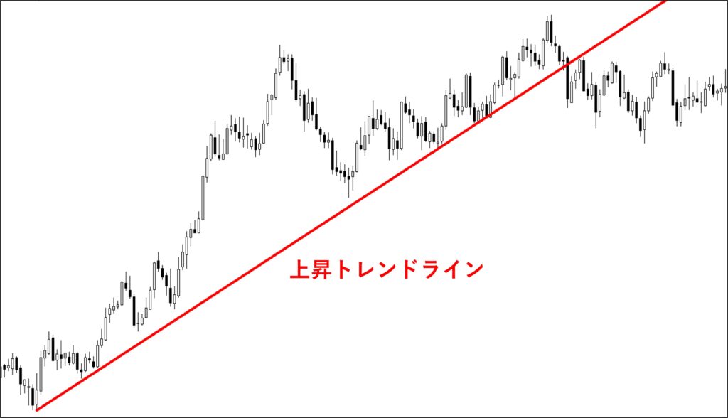 上昇トレンド時に安値と安値を斜めに引くのが「上昇トレンドライン」です。上昇トレンドラインに触れたときが買い注文のタイミングとなります。