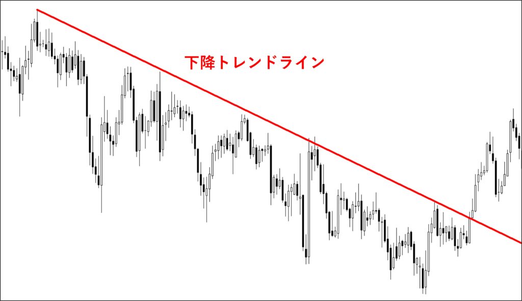 下降トレンド時に高値と高値を斜めに引くのが「下降トレンドライン」です。こちらも下降トレンドラインで反転した箇所が売り注文のタイミングです。