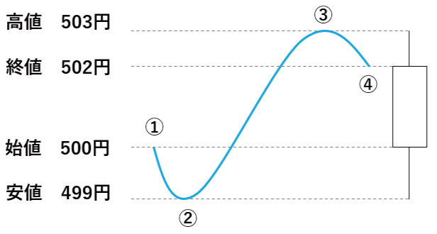 例えば日足のローソク足で、その日の株価が500円で始まり(①)、499円まで下がり(②)、その後503円まで上昇して(③)、最後に502円で終わったのが図のローソク足です。