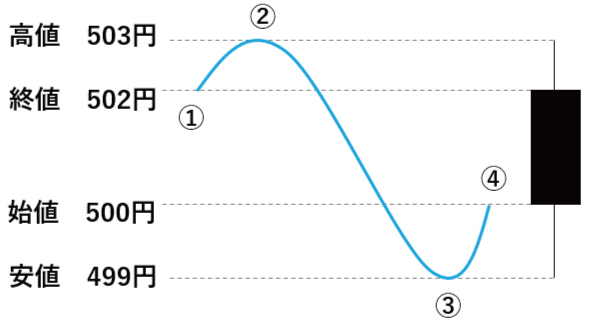 一方、502円で株価が始まり(①)、503円まで上昇して(②)、その後に499円まで下がり(③)、最後に500円で終わったのが図のローソク足です。