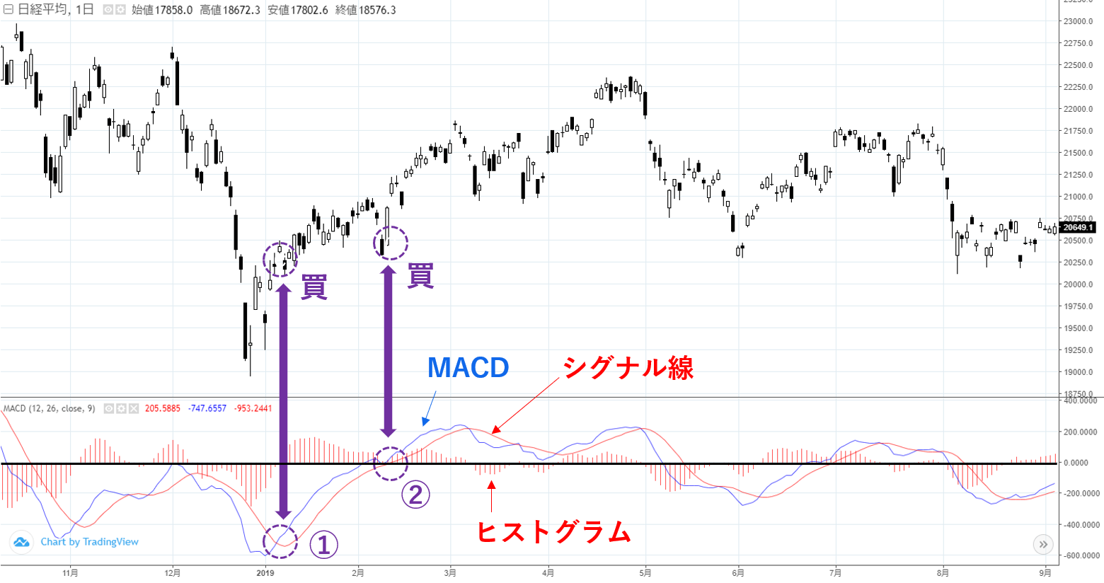 MACDを使った売買ポイントは主に2つです。