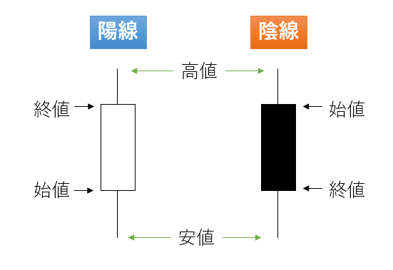 始値よりも終値が高いのが「陽線(ようせん)」、始値より終値が低いのが「陰線(いんせん)」です。