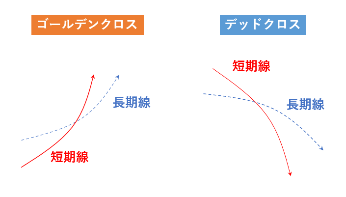 移動平均線の使い方は非常にシンプルで、期間の異なる2種類の移動平均線を表示させます。そして、短期移動平均線が長期移動平均線を「下から上へクロスしたら買い(ゴールデンクロス)」「上から下へクロスしたら売り(デッドクロス)」です。