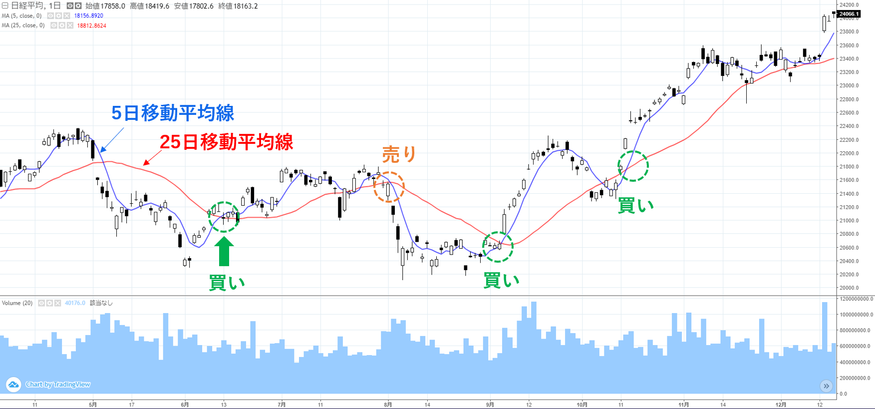 下のチャートは日経平均株価の日足チャートで、期間が5と10の移動平均線を表示させていますが、ゴールデンクロスとデッドクロスが売買シグナルとして機能しているのが分かりますね。