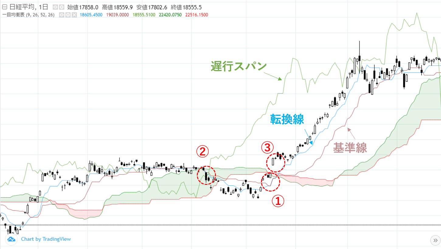 - 遅行スパンがローソク足を上抜けたとき(②)