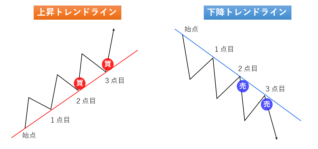 一度トレンドラインが引けると、そのライン上で反発する可能性があるので、2点目以降の反転ポイントで買いまたは売りを仕掛けることができます。