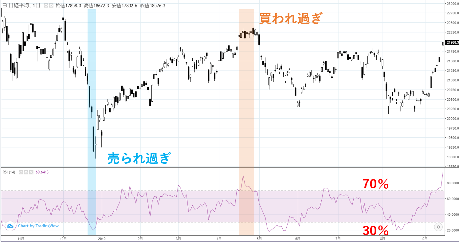 一般的に70%以上で買われ過ぎ、30%以下で売られ過ぎの状態を示します。