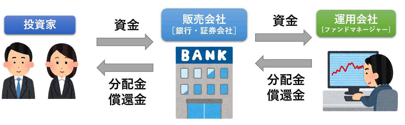 投資信託というのは、多数の投資家から集めたお金をひとつにまとめて専門家(運用会社のファンドマネージャー)が運用し、その利益が販売会社(銀行や証券会社)、そして投資家への分配金・償還金となります。