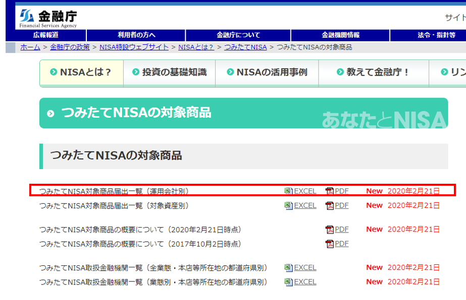ちなみにつみたてNISAの商品の一覧は金融庁のホームページからでも確認することができます。
