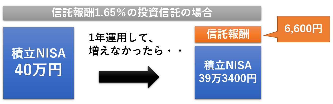 信託報酬が1.65%の投資信託で40万円を1年間運用して、まったく増えなかった場合、信託報酬として6,600円が引かれるので、残高は393,400円となります。