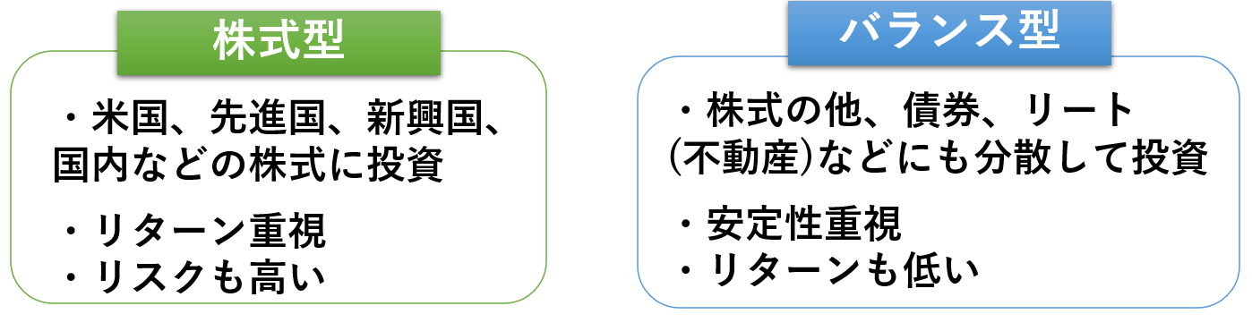 一方でバランス型は、株式の他に債券やREIT(不動産)などに分散して投資するため、安定性重視でリスクは低めです。