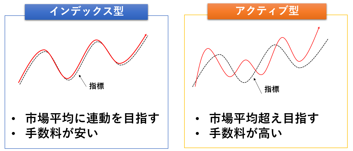 大きな違いは信託報酬になります。市場平均との連動を目指すインデックス型の方が、アクティブ型よりも信託報酬は安くなります。ですからインデックス型がおすすめです。